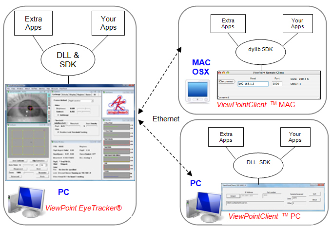 ViewPointClient ® is a program that can run on a remote computer (or on the same computer in a different folder) and communicates with the ViewPoint EyeTracker. ViewPointClient interfaces to a copy of the DLL and exchanges data just like the ViewPoint EyeTracker does, but it typically takes less than one percent of CPU resources. This means that the same “layered” applications can be used on a remote computer just as easily as on the same computer. The ViewPoint EyeTracker includes an Ethernet server; the ViewPointClient establishes an Ethernet link with this server. ViewPointClient™ for PC and MAC OSX is included free with the ViewPoint EyeTracker ®.
